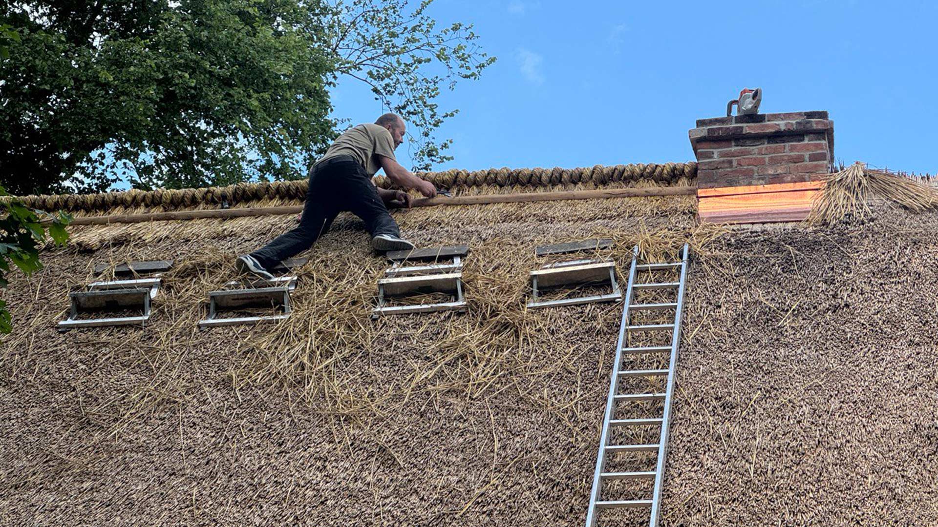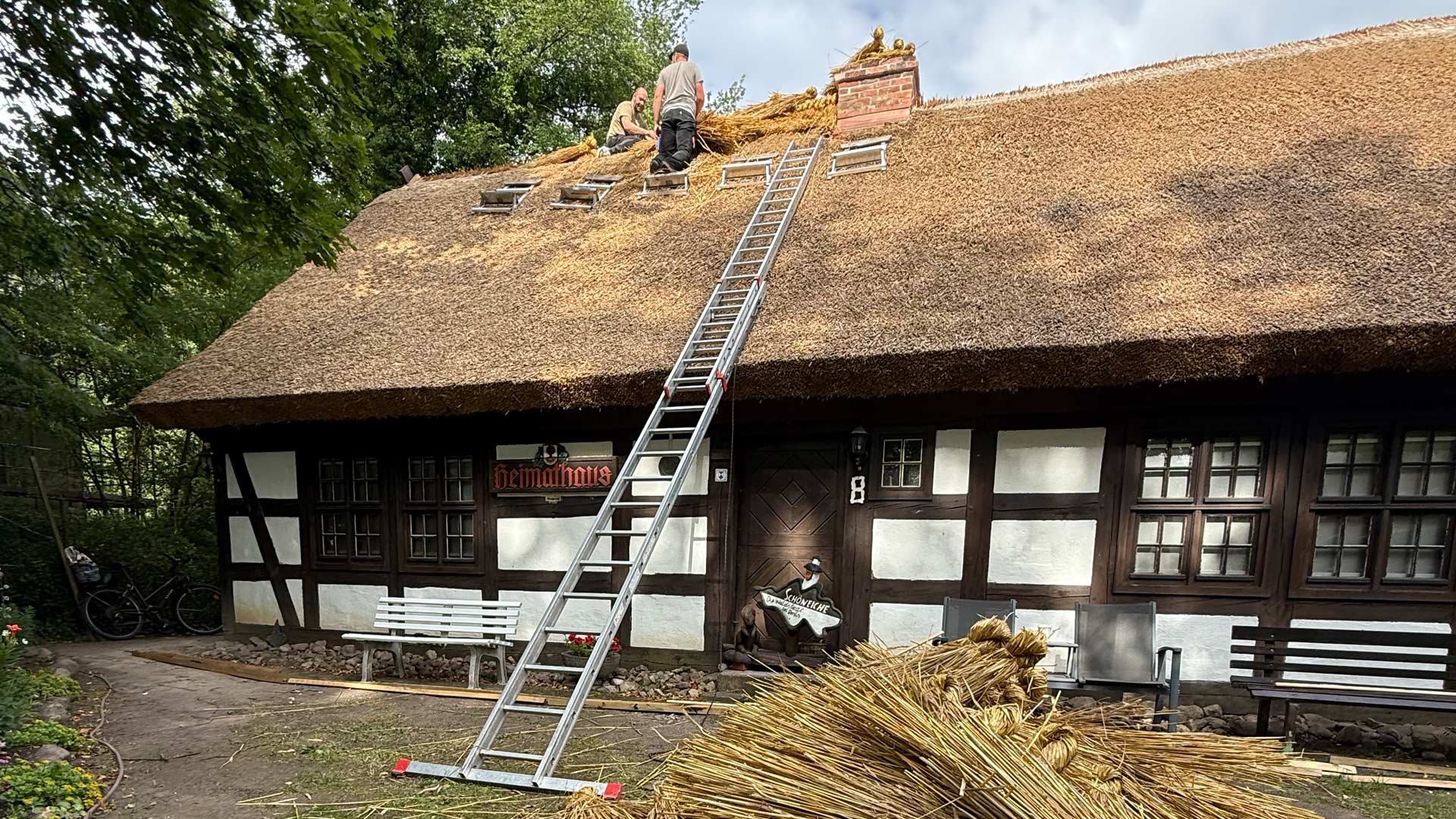 Das Heimathaus besitzt ein traditionelles Reetdach, das sein äußeres Erscheinungsbild entscheidend prägt. Es ist typisch für bäuerliche Bauten der östlichen Mark Brandenburg. Es wurde von uns saniert neu eingedeckt. Die Sanierung mit einem traditionellen Reetdach war eine spannende Aufgabe, deren Ergebnis sowohl optisch als auch klimatisch überzeugt. Wir haben zudem einen Teil der Kosten an die Gemeinde Schöneiche gespendet, um die lokale Kulturpflege weiter zu unterstützen.