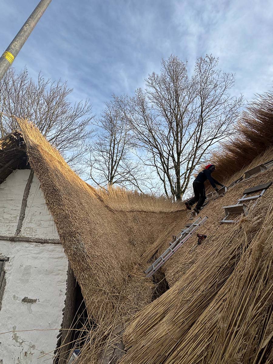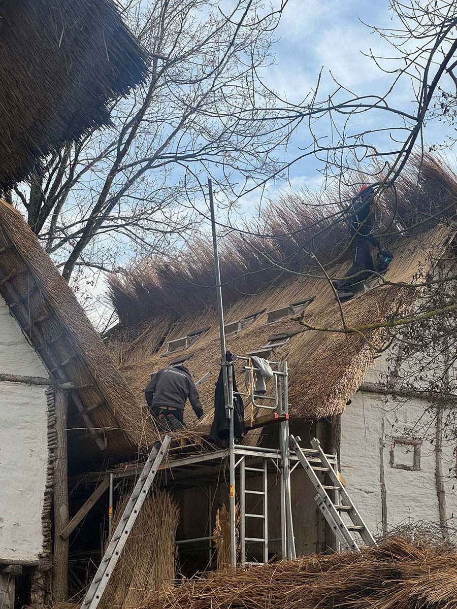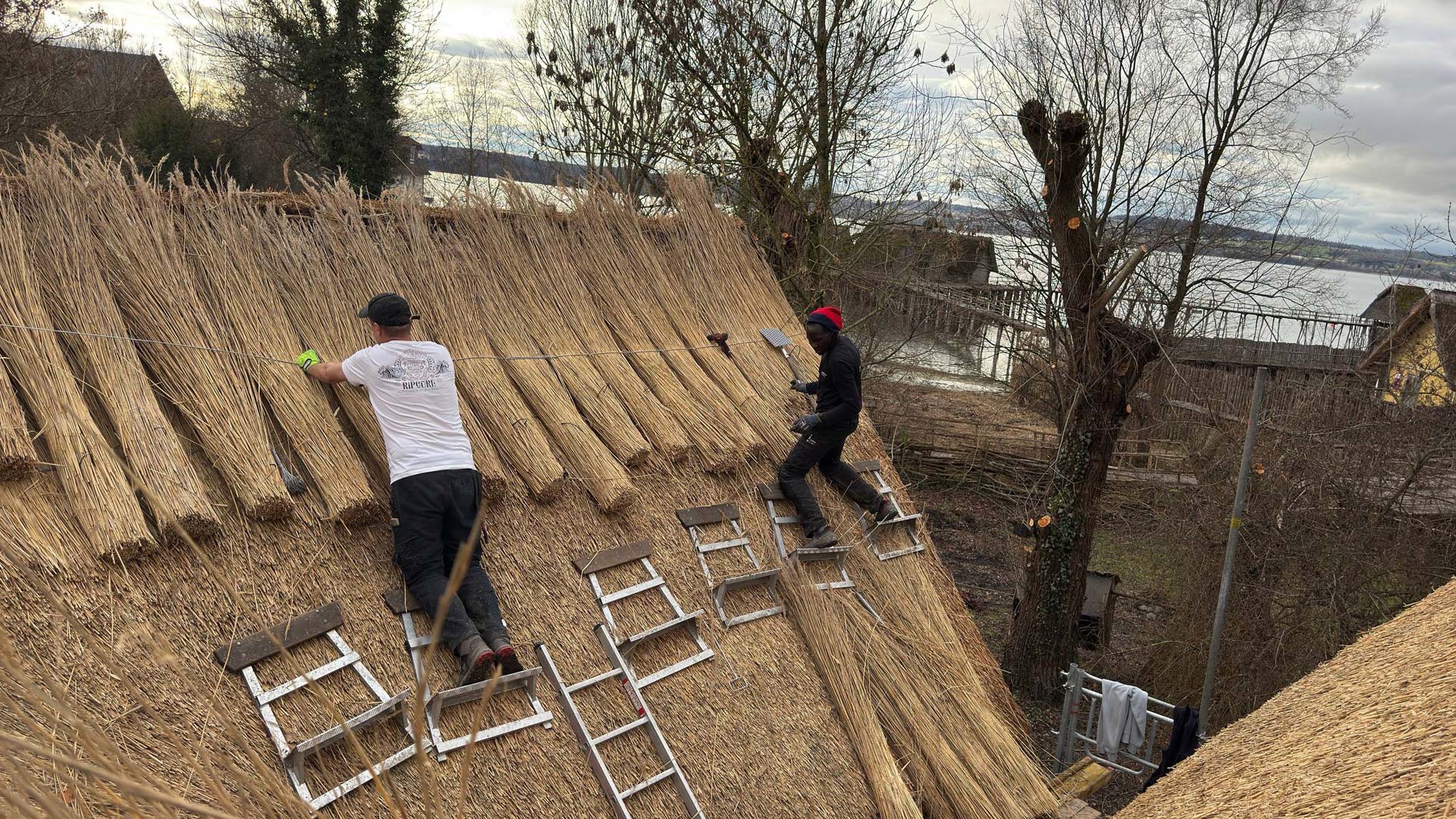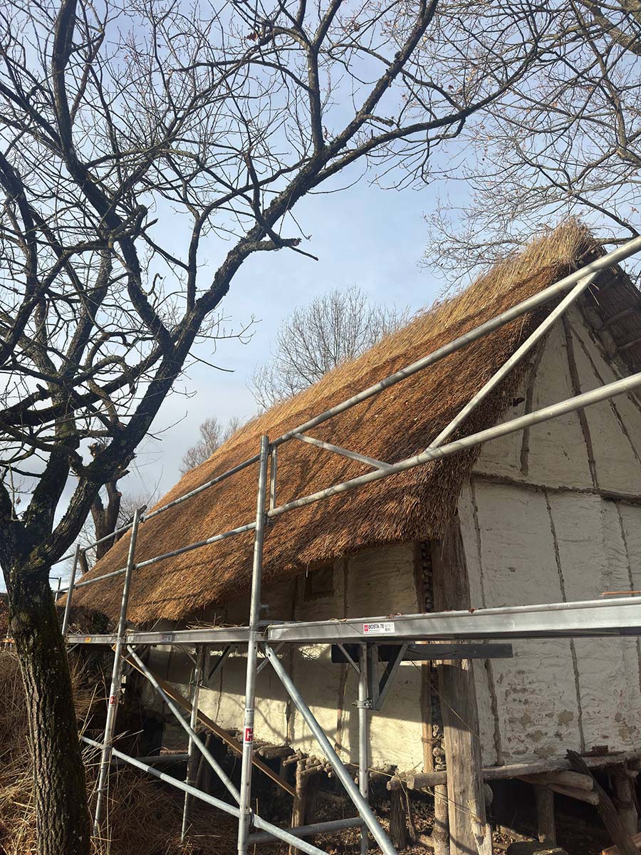 Die Dächer der rekonstruierten Häuser bestehen aus Reet, einem der zentralen Baumaterialien der Pfahlbauten Unteruhldingen. Wie schon in der Jungstein- und Bronzezeit wird es in dicken Bündeln aufgebracht, bietet guten Schutz vor Regen und trägt dazu bei, das historische Erscheinungsbild der Siedlungen möglichst authentisch nachzuempfinden. Wir übernahmen die komplette Neueindeckung des Daches des Hauses für Schulpädagogik sowie die Wartung weiterer Dächer.